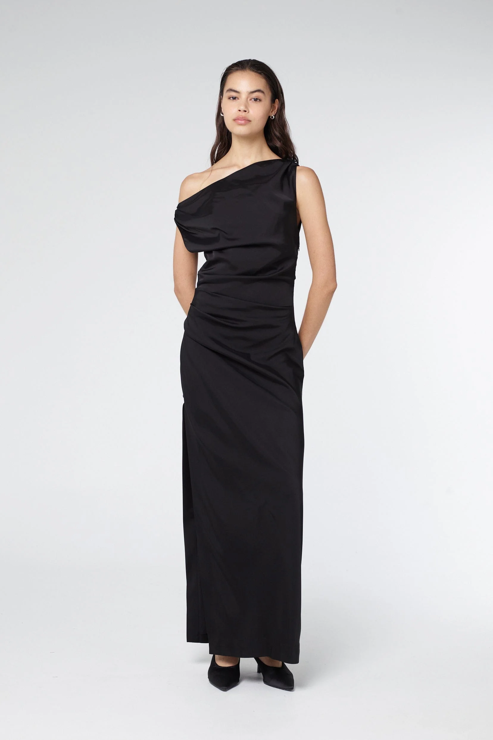 The Athena Off Shoulder Maxi Dress is designed to drape effortlessly over the body with a refined fit. Featuring a cowl neckline that sits off the shoulder, it offers a flattering shape. Tuck detailing along the shoulder seam and a covered button on the left shoulder add subtle details.Â