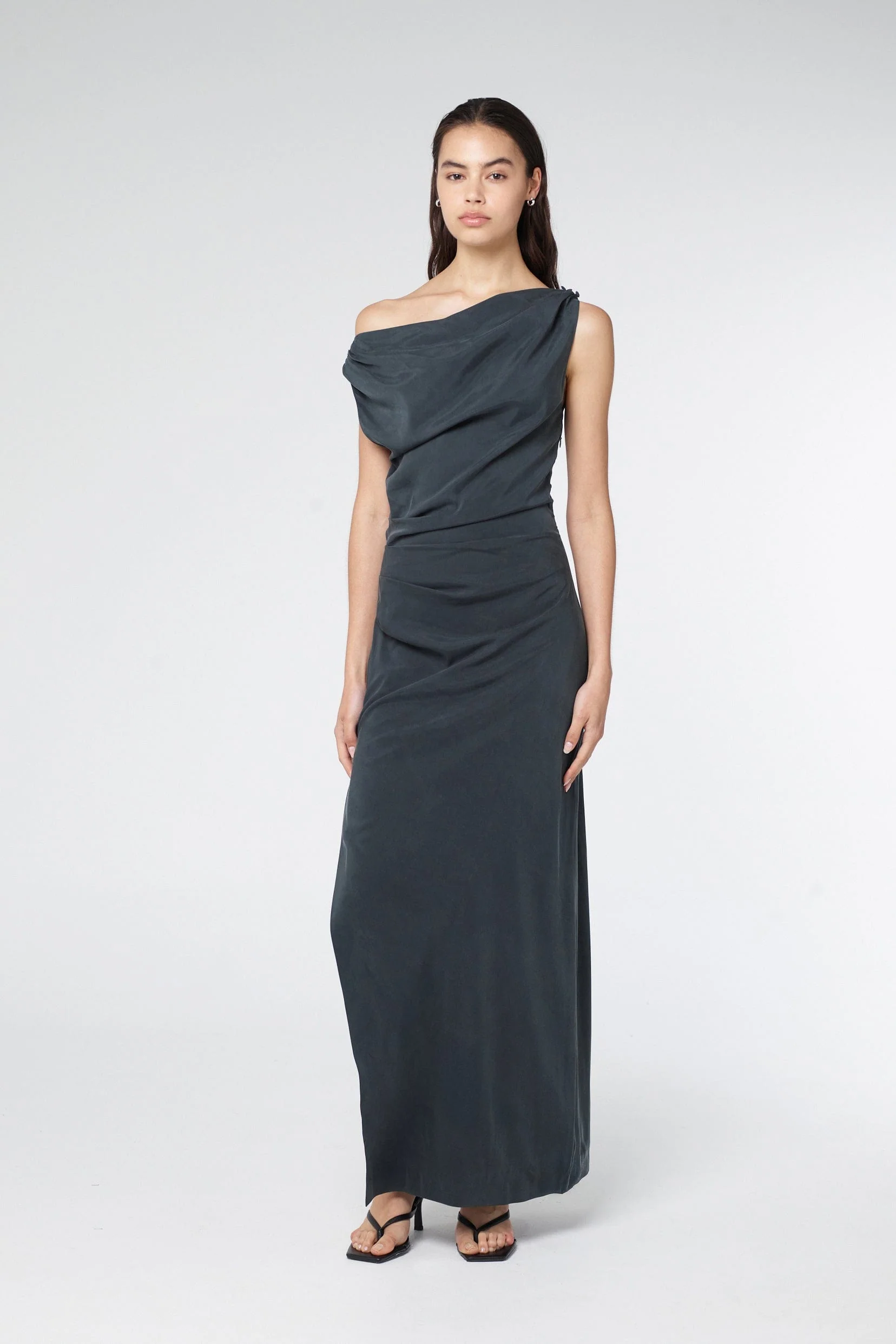 The Athena Off Shoulder Maxi Dress is designed to drape effortlessly over the body with a refined fit. Featuring a cowl neckline that sits off the shoulder, it offers a flattering shape. Tuck detailing along the shoulder seam and a covered button on the left shoulder add subtle details.Â