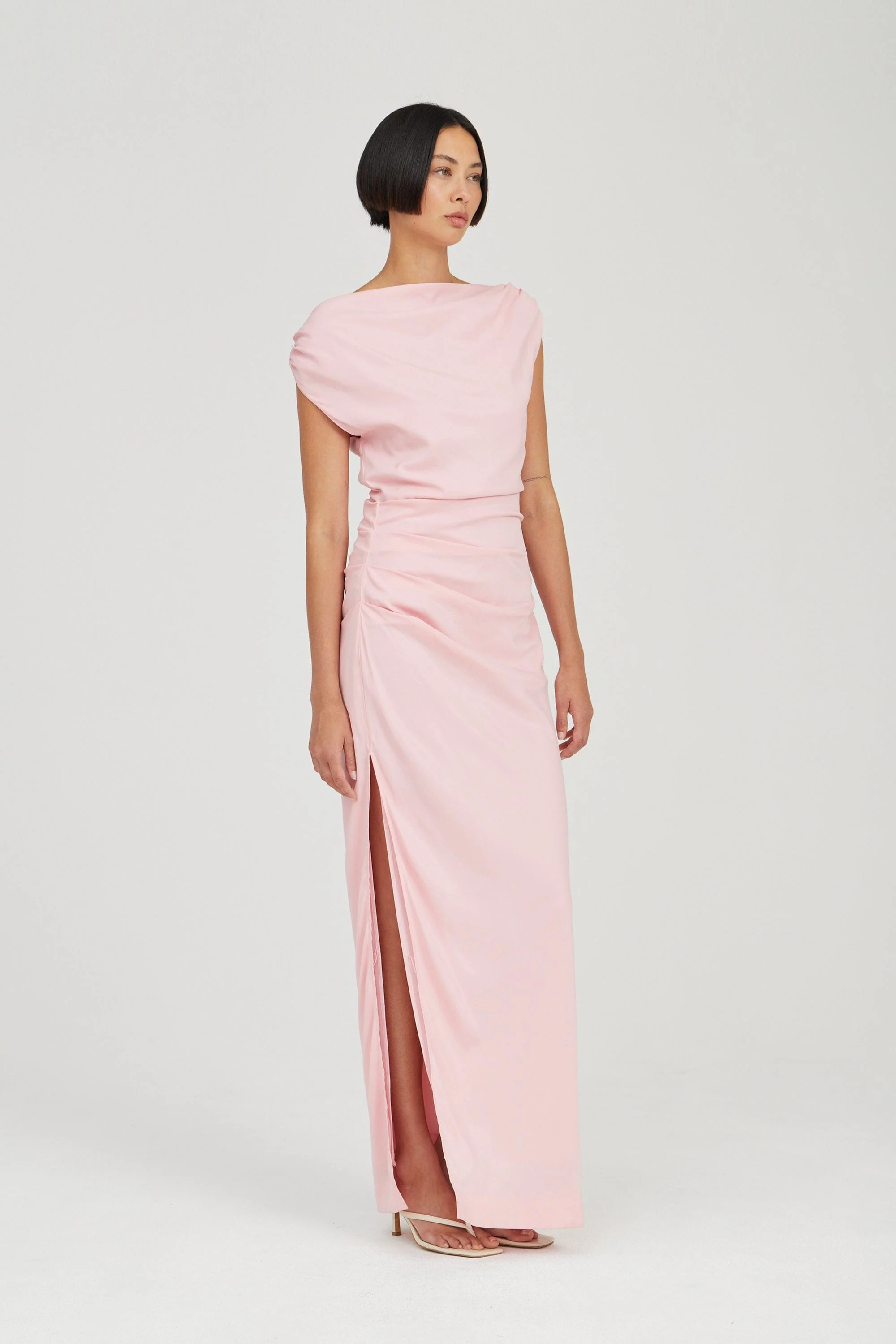 The Athena Off Shoulder Maxi Dress is designed to drape effortlessly over the body with a refined fit. Featuring a cowl neckline that sits off the shoulder, it offers a flattering shape. Tuck detailing along the shoulder seam and a covered button on the left shoulder add subtle details.Â