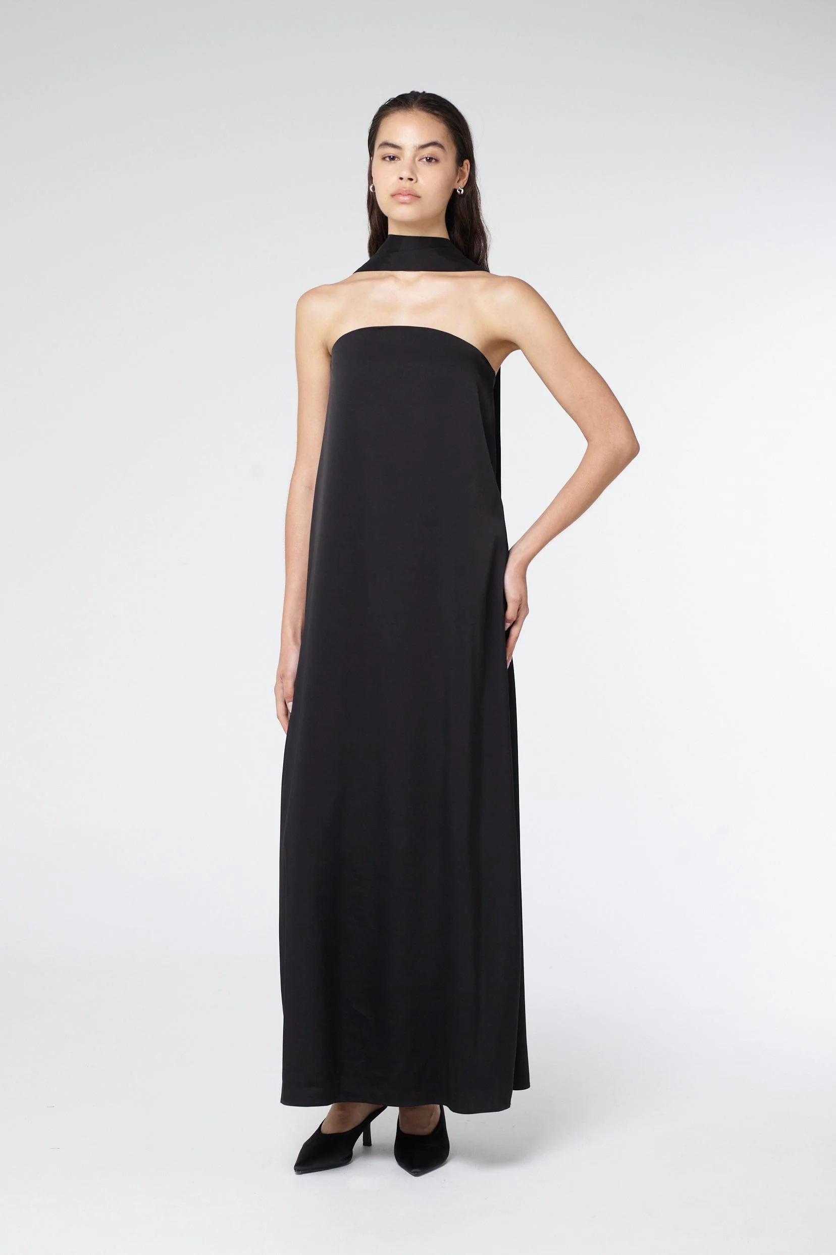 The Bia Strapless Maxi Dress is a flowing maxi that drapes effortlessly over the body for a refined, relaxed fit. Designed with a fitted corset lining for added support and shape, it offers structure while maintaining a sense of ease. A detachable necktie adds styling versatility, while the semi-circular flare through the hem creates graceful movement.