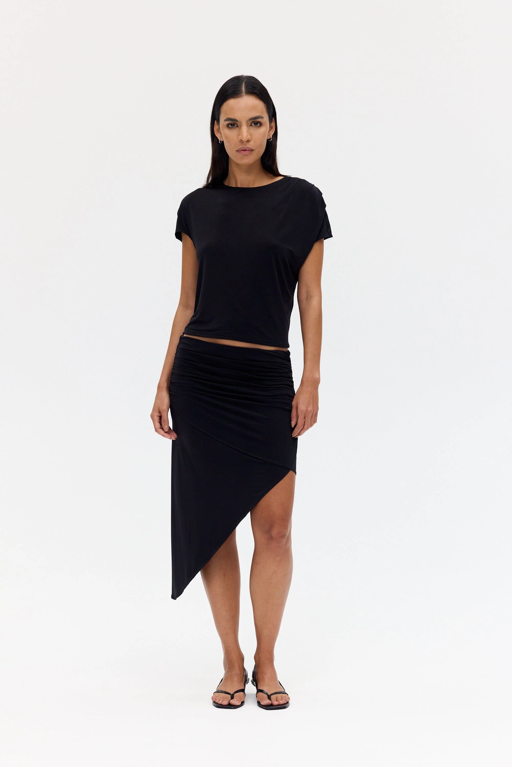 The Crave Drape Skirt is defined by its asymmetric lines and fluid draping. Cut to a slim fit, the dual-layered design is softly gathered at the sides to create dimension and ease. A concealed elasticated waistband allows for effortless wear, while the asymmetric hem brings a directional finish to this versatile piece.