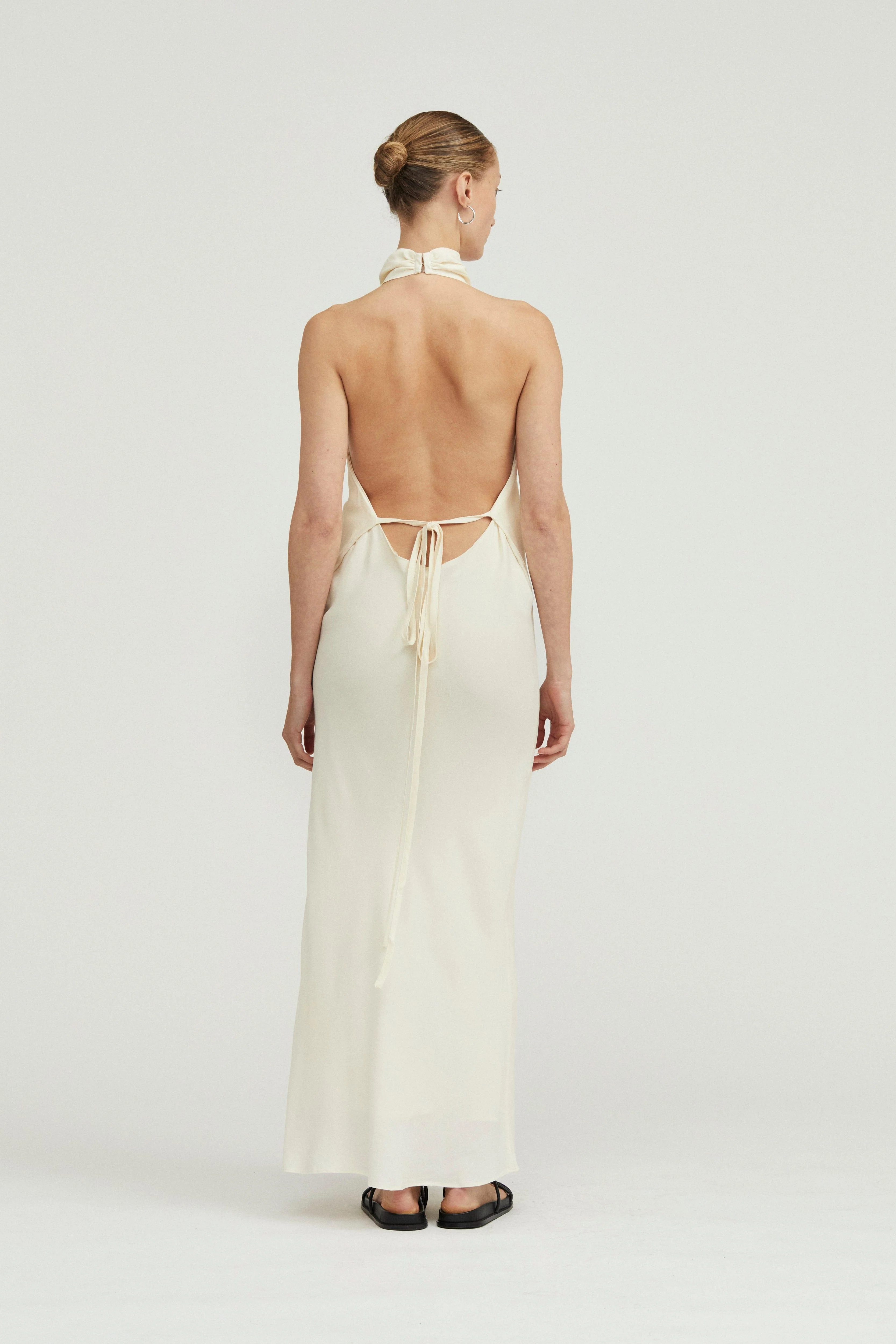 Unveil a new standard of modern allure with the Day Dreamer Kite Maxi Dress in a rich creamy hue. The meticulous design, featuring a raised cowl neck and kite-shaped wrap waistline, exudes a sense of timeless modernism. Featuring a halter with a hand-sewn hook-and-eye closure and tie detailing, this dress allows for versatile styling and a sculptural silhouette. Composed of 54% Viscose and 46% Lenzing™ Ecovero™ Rayon, this dress has a light and dry-touch feel, making it a sophisticated choice for various occasions.
