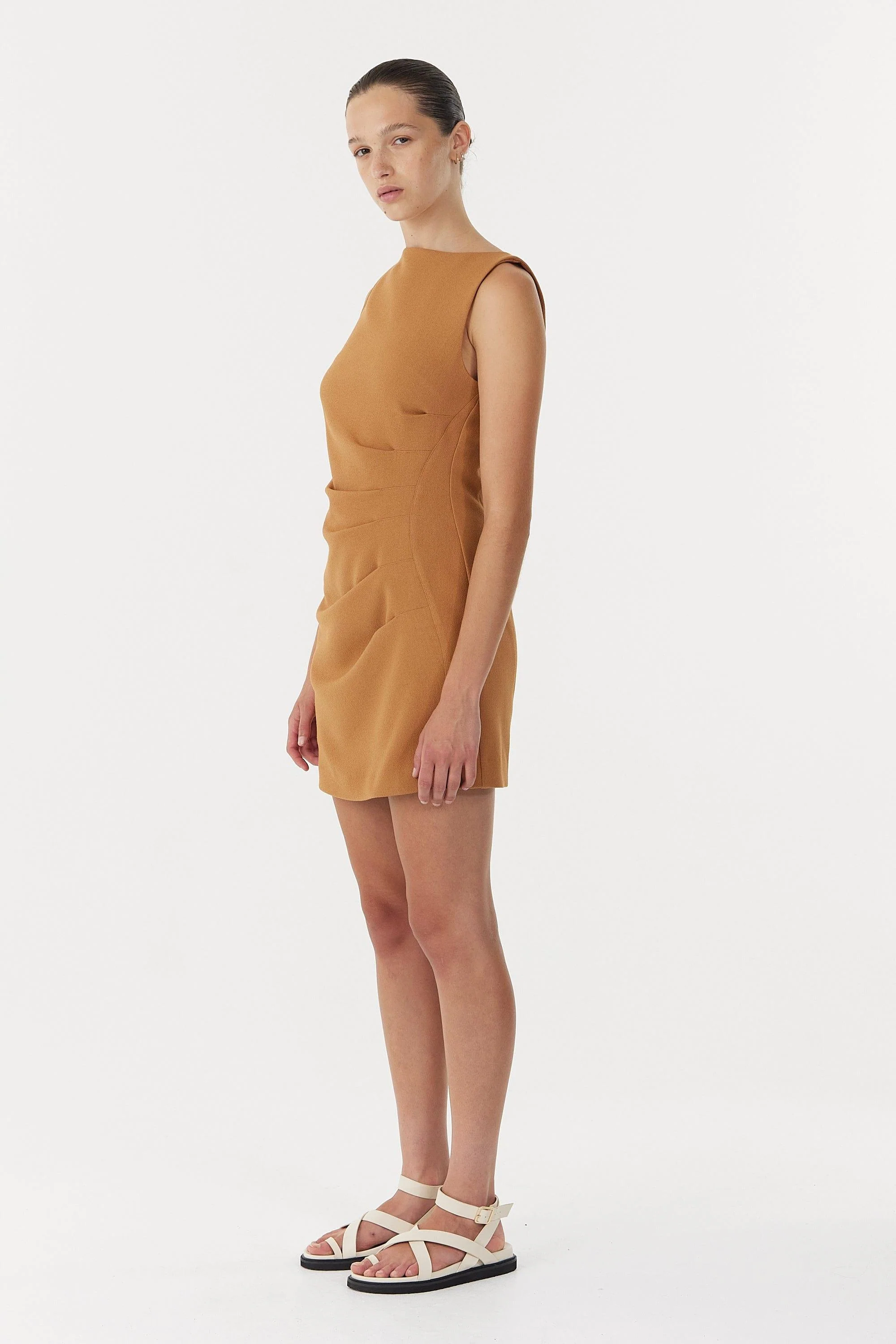 A camel mini dress created with the Modern Muse in mind. Featuring a high and wide neckline, with sculpted S pen asymmetric panel pleats across the waist designed to sculpt the wearer. Luxurious finishes adorn this design, with top stitch detailing across pleats for another layer of depth. Fully lined to ensure maximum comfort from the office through to dinner plans. Crafted from a weighted textured fabrication that is crease resistant, making this the perfect addition to your travel wardrobe.