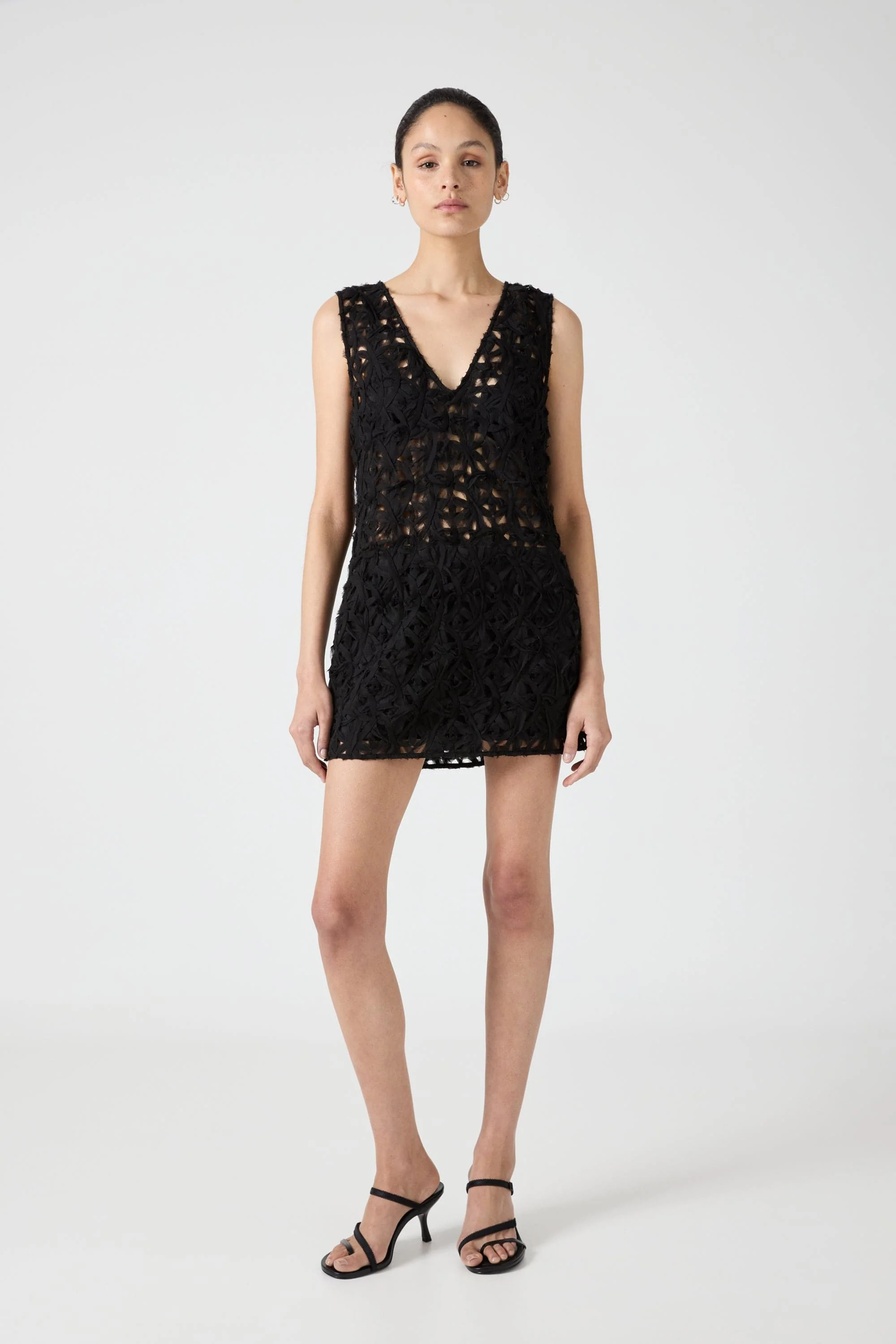 The Ethereal Mini Dress is designed with a V-neckline and a relaxed fit, made from custom-developed textured fabric with a sheer finish. A removable bralette and attached solid skirt provide support and coverage, while bound internal seams and an invisible side zipper complete the look.