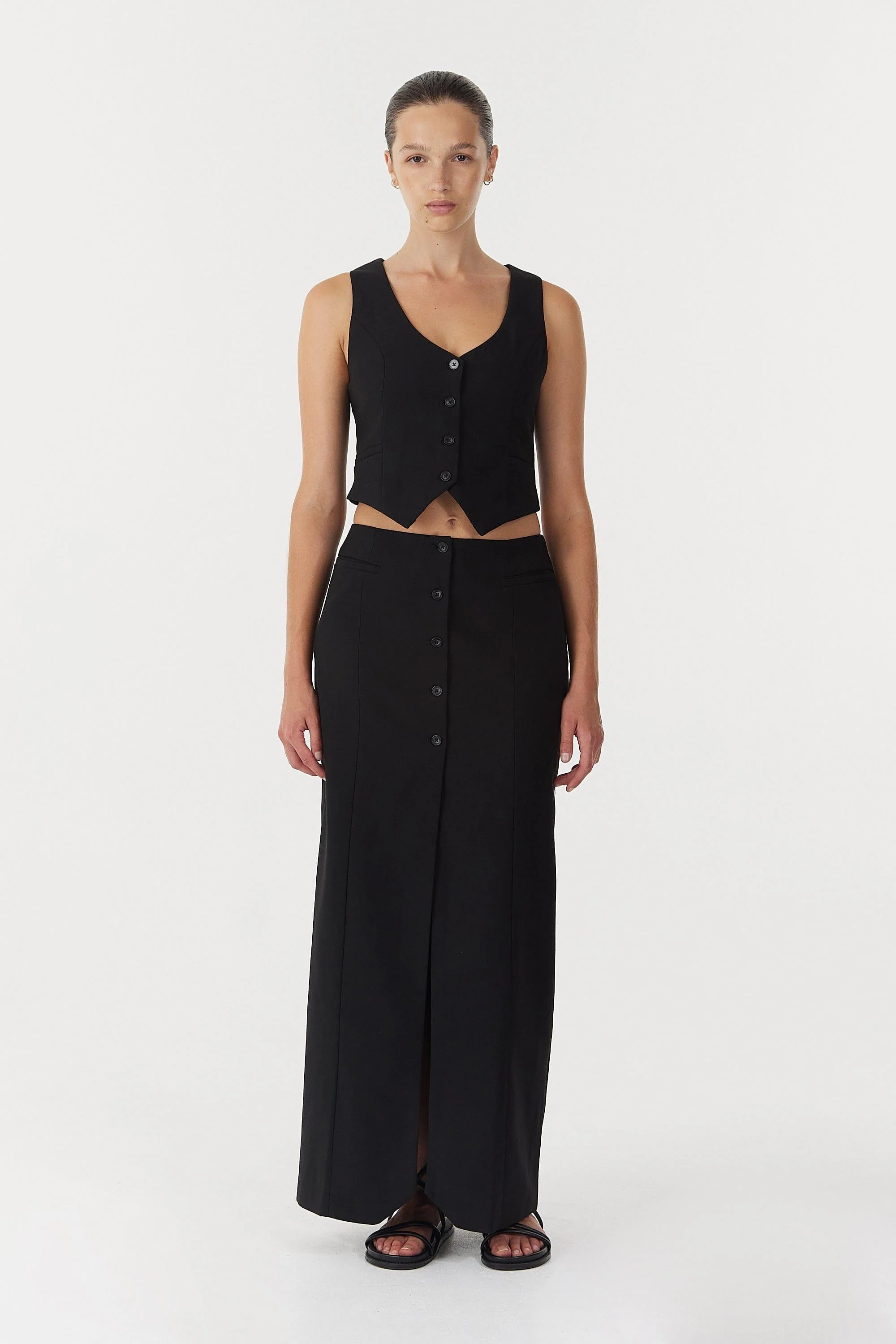 The Metropolis Waistcoat reimagines traditional masculine tailoring, infusing it with a touch of femininity. Crafted in a slim-fit silhouette, this vest features luxurious black tortoiseshell buttons that add a refined element. Carefully tailored with a scooped neck, false jet pockets, and princess-cut paneling through the bust, it embodies Third Form's signature blend of modern and classic aesthetics. This versatile layering piece effortlessly pairs with the Line Up Knit Crew or basic tees, creating a polished street-to-work ensemble, especially when paired with the matching Metropolis Tailored Maxi Skirt.