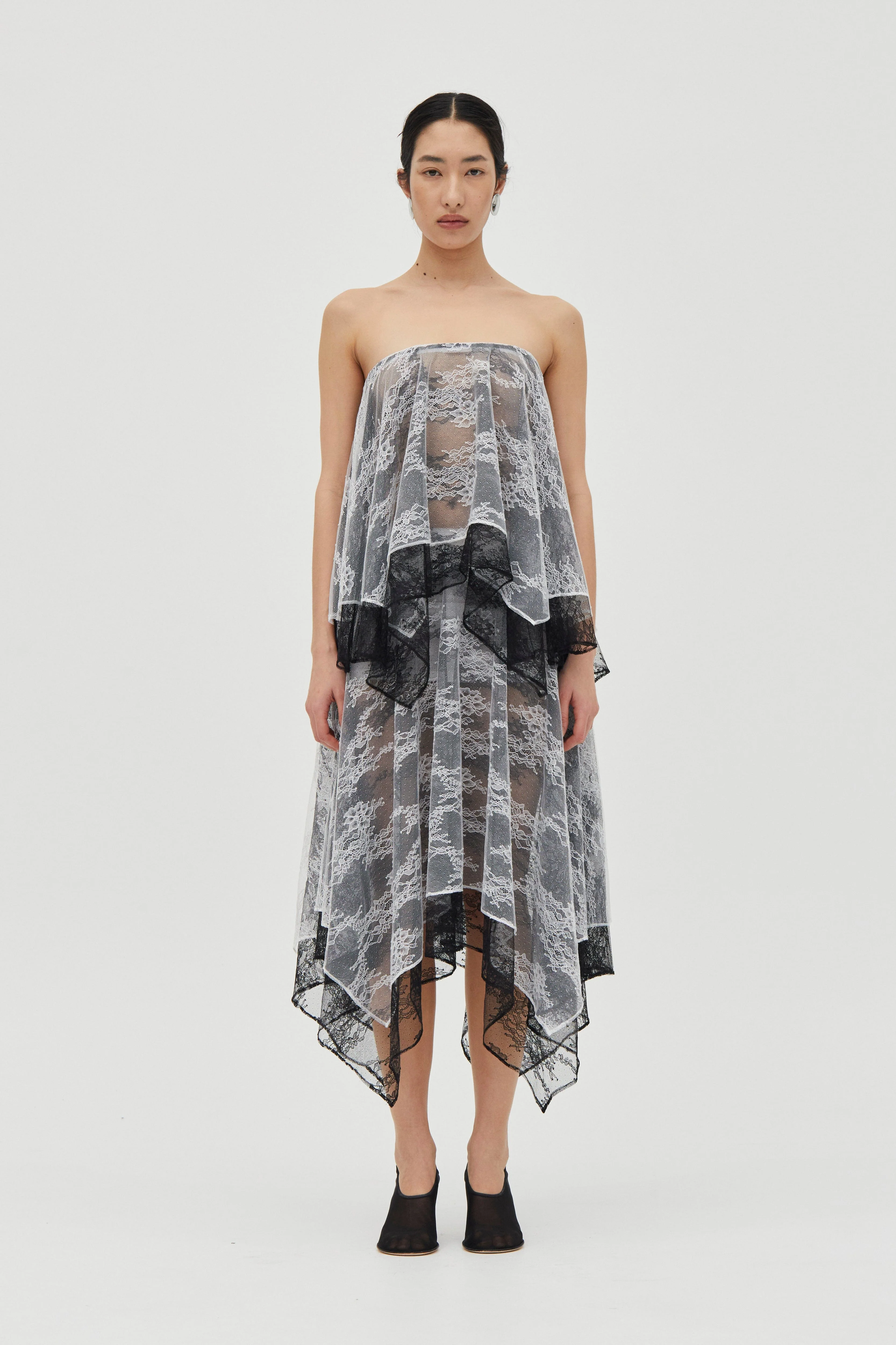The Reflect Strapless Top is crafted from a sheer double-layered lace with a soft circular cut. The draped silhouette is finished with fine scalloped trim detailing around the neckline. Designed to slip on with ease, it features reversible styling, allowing the top to be worn two ways.