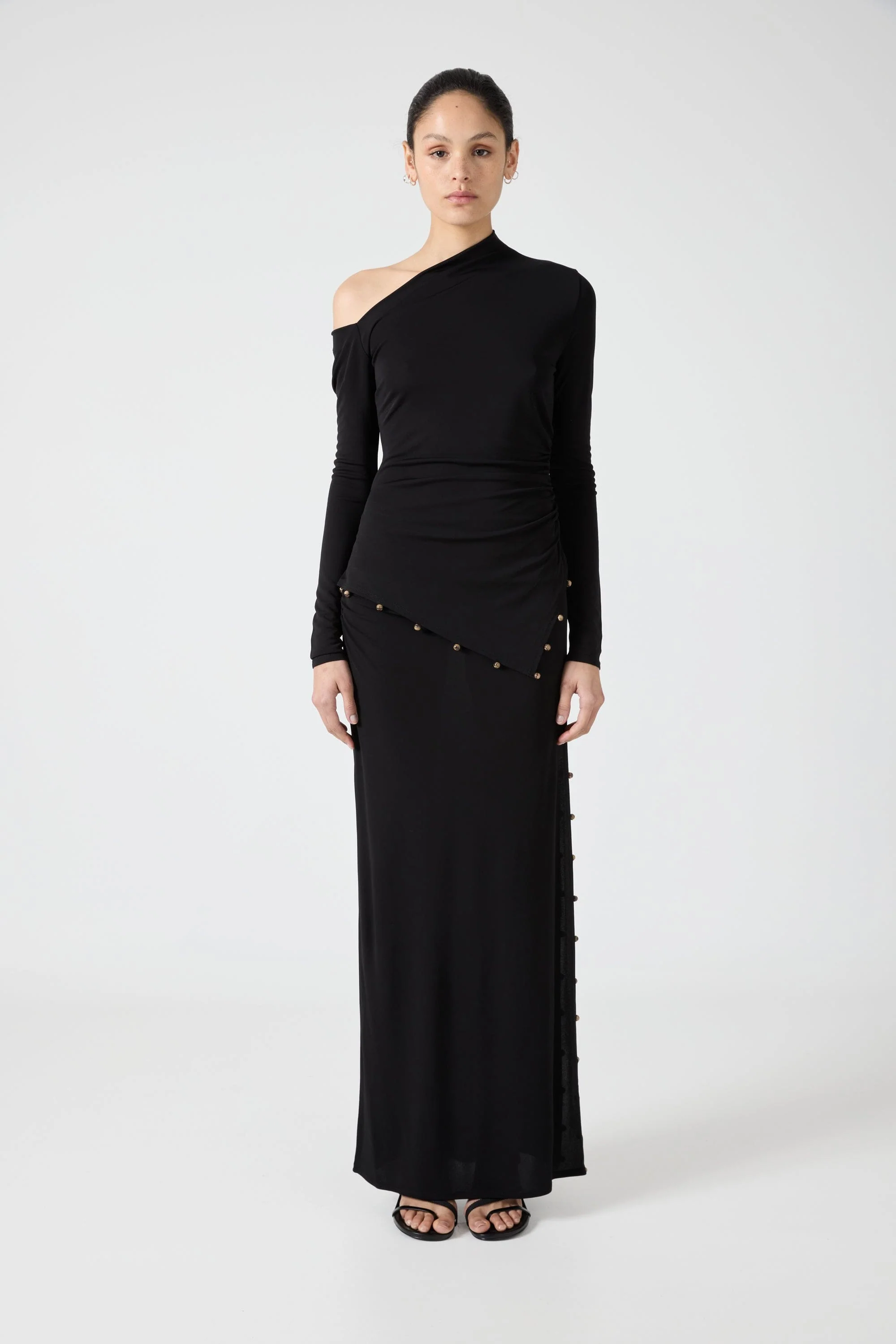 The Rolling Stone Top features an asymmetric off-the-shoulder neckline for a unique, modern look. A slim fit with gathering through the side seam and a side split shapes a flattering silhouette. Finished with hand-sewn beads along the asymmetric hem for added detail.